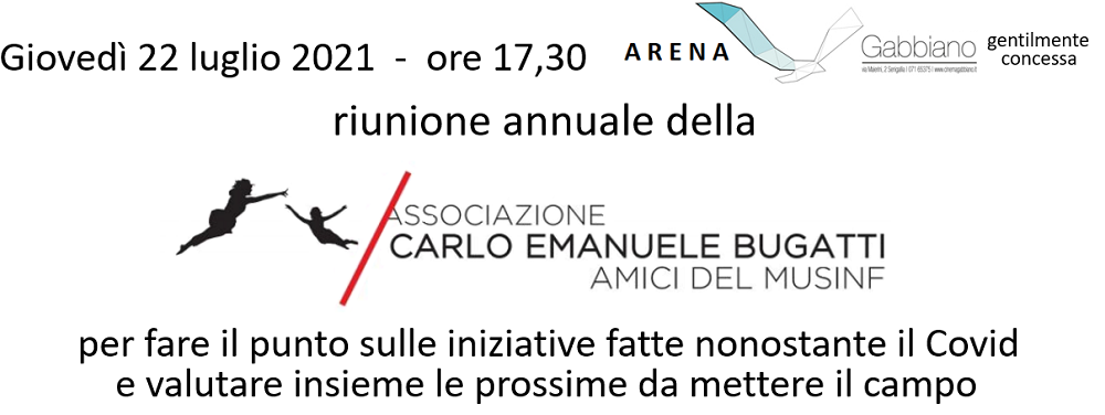 Il 22 luglio 2021 si è svolta, nei locali della arena del Gabbiano, gentilmente concessa, la riunione annuale della associazione Carlo Emanuele Bugatti-Amici del Musinf. Erano presenti molti aderenti e si è avuto modo di fare il bilancio delle tante iniziative alle quali ha partecipato l'associazione pur in questo anno difficilissimo, segnato dalla terribile pandemia.